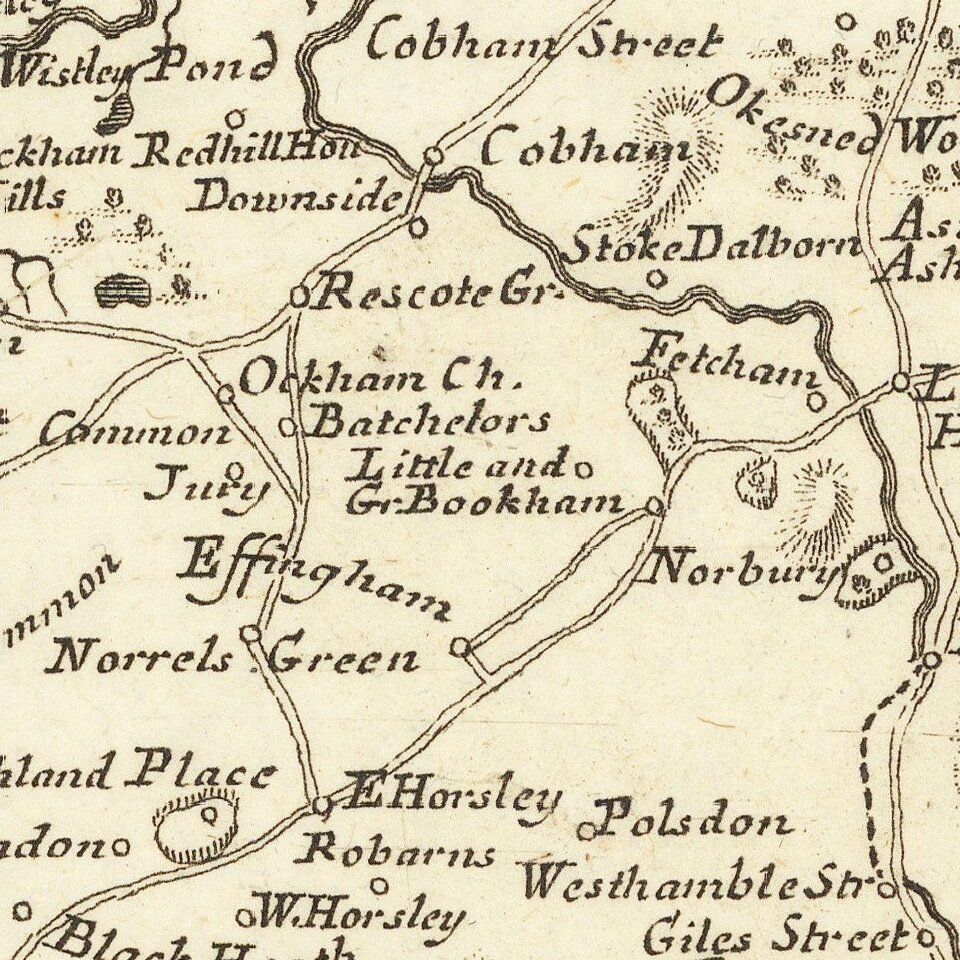 Antique map of the Surrey and adjoining Home Counties. In the 18th century layout of the county, the northern border is marked by the River Thames, and Surrey includes parts of London, though Westminster and the Isle of Dogs form part of Middlesex. Guildford, Chelsea, Battersea, and many other settlements are shown. Small parts of adjoining counties, including Kent, Sussex, Hampshire, Barkshire, and Middlesex are shown. Roads, rivers, and hills are portrayed. Part of what Zatta might have considered a typical Surrey scene, with a lone pine tree, is shown next to the title.