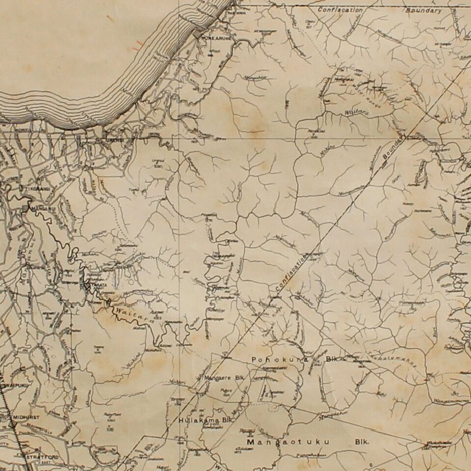 The Confiscation Boundary refers to the lands confiscated from the Maori under the New Zealand Settlements Act 1863. In December 1863 the Parliament passed the New Zealand Settlements Act 1863, punitive legislation allowing unlimited confiscation of Māori land by the government, ostensibly as a means of suppressing "rebellion". Under the Act, Māori who had been "in rebellion" could be stripped of their land, which would be surveyed, divided and either given as 20 hectare farms to military settlers as a means of establishing and maintaining peace, or sold to recover the costs of fighting Māori. Volunteers were enlisted from among gold miners in Otago and Melbourne for military service and a total of 479,848 hectares were confiscated in Taranaki by means of proclamations in January and September 1865. Little distinction was made between the land of "rebels" and Māori loyal to the government.