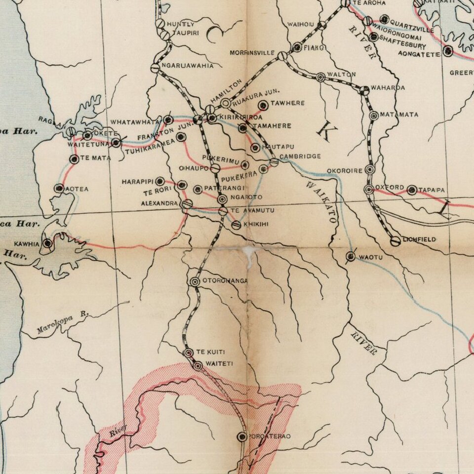 Map of the North Island of New Zealand showing railways, railway stations, post and telegraph offices and postal routes. Relief shown by hachures.