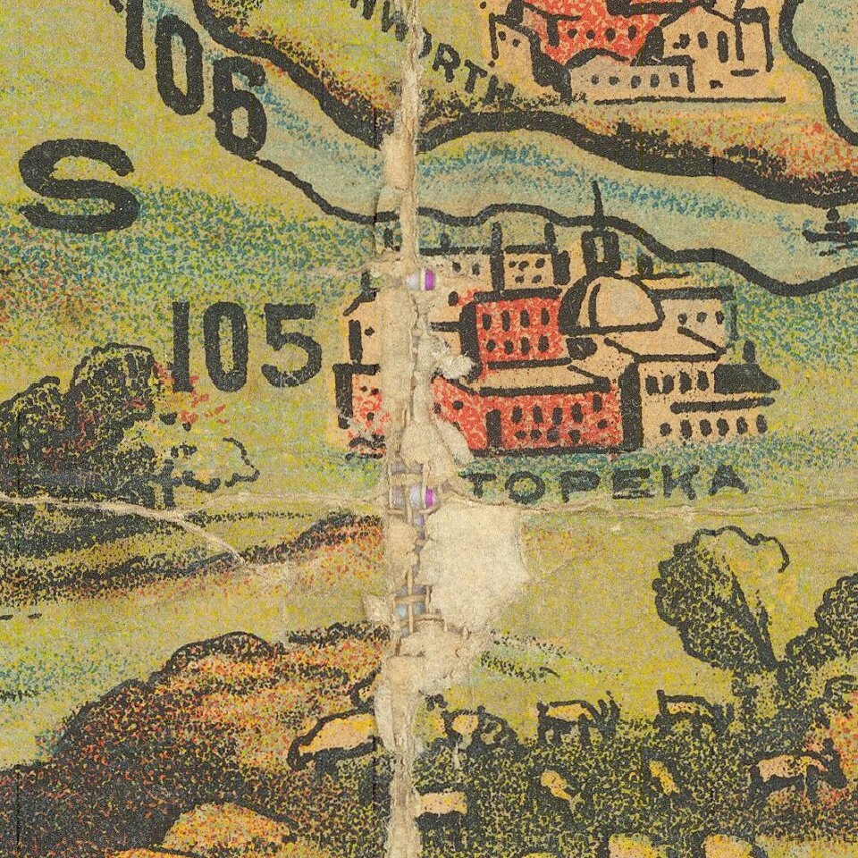 The principal cities of the US are depicted, as are natural resources or landmarks. Texas is shown with Indians chasing a large herd of buffalo. California is dominated by scenes of Yosemite. Also, at the bottom left is a large view of 4 Indians, with rifles, looking down anxiously at a train passing through a mountain pass. At the top right is a view of the Statue of Liberty.