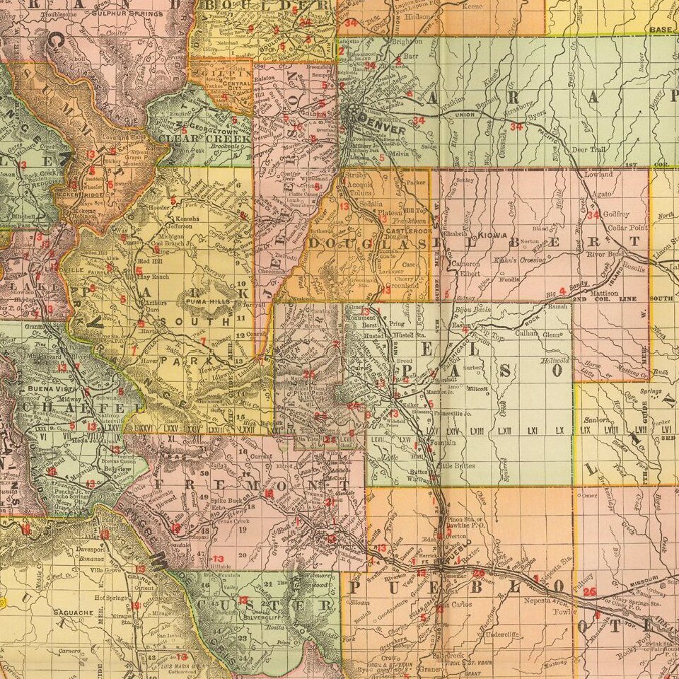 Highly detailed separately issued pocket map of Colorado, showing counties, townships, towns, railroads (numbered), railway stations, rivers, lakes, etc.