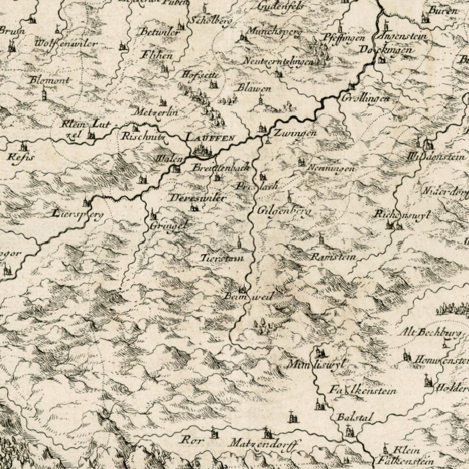 Scarce regional map of the region around Basle, including a striking cartouche.
