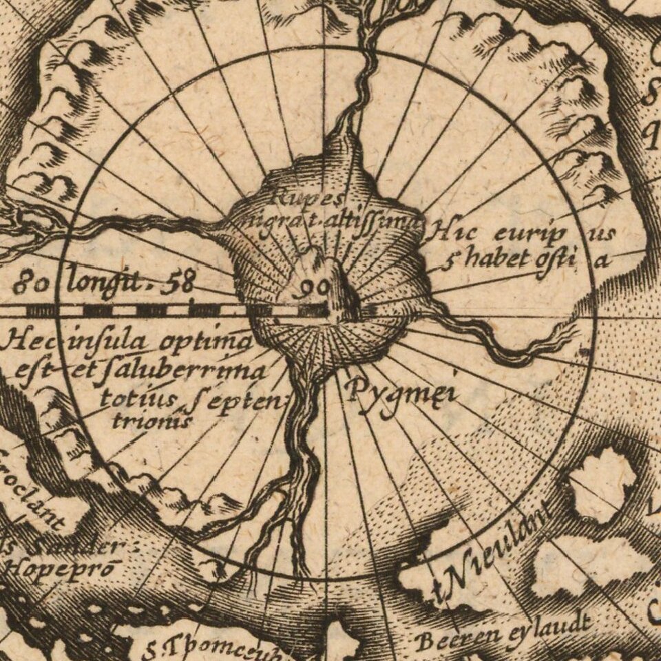 Bertius' map shows Mercator's work in the second state, which was revised to show an unknown coastline on the central island at the lower right. The first state of Mercator's map can be distinguished from later editions by its inclusion of a definitive coastline in the lower left of the 4 islands surrounding the pole (Pygmei). Later editions omit part of the coastline.