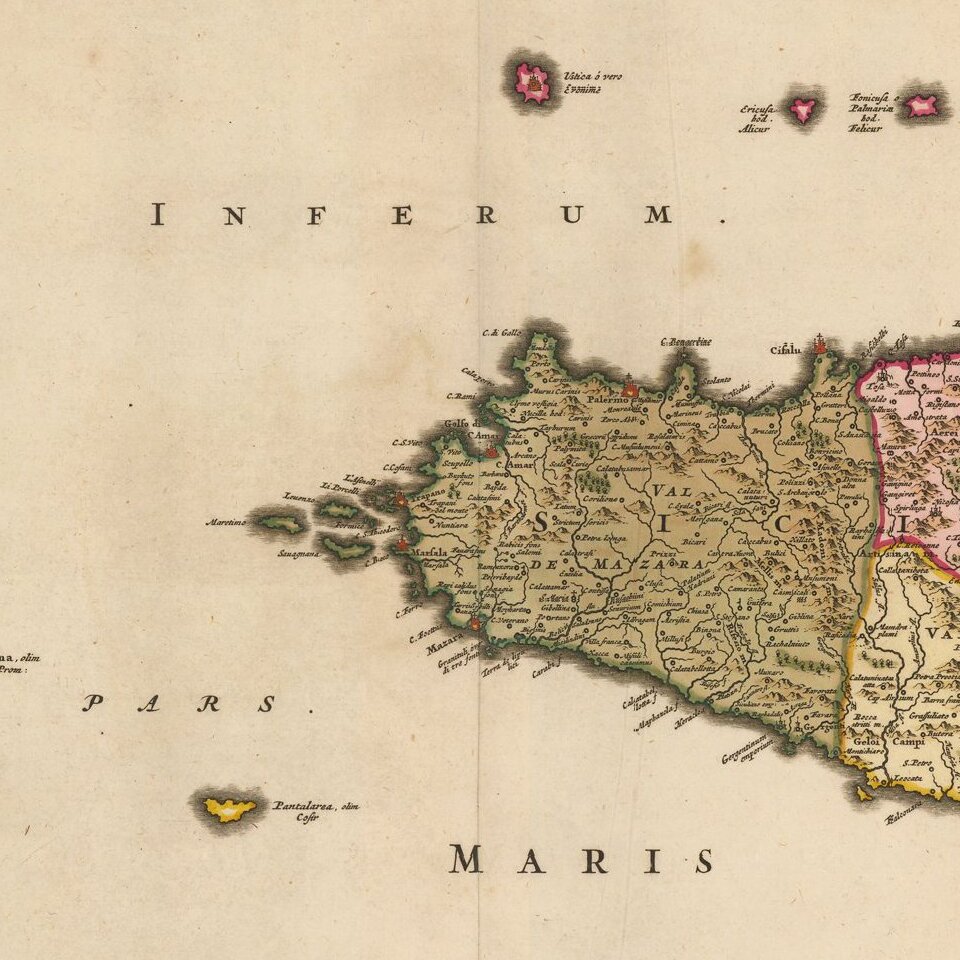Fine old color, gold leaf example of Visscher's map of Sicily, Malta and a bit of Naples and Sardinia.