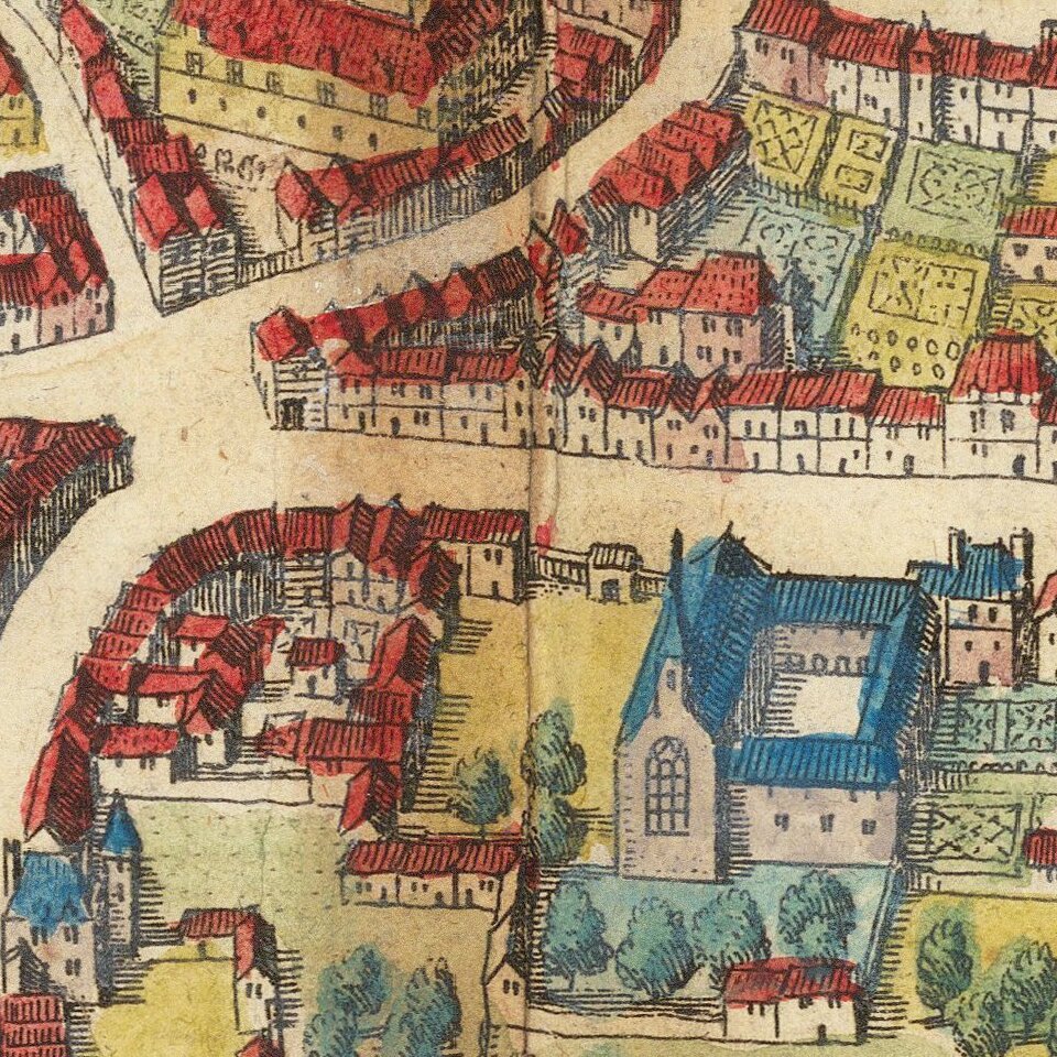 Mathaus Merian (1593-1650) was the father of engraver Matthäus the Younger, and of the painter, engraver, and naturalist Maria Sibylla Merian. He was born in Basel, Switzerland and trained in engraving in Zurich. After a time in Nancy, Paris and Strasbourg, he settled in Frankfurt. While there, he worked for Johann Theodor de Bry, the publisher and son of the travel writer. In 1617, he married Maria Magdalena de Bry, Johann Theodor’s daughter. In 1623, Merian took over the de Bry publishing house upon the death of his father-in-law. Merian’s best known works are detailed town views which, due to their accuracy and artistry, form a valuable record of European urban life in the first half of the sixteenth century