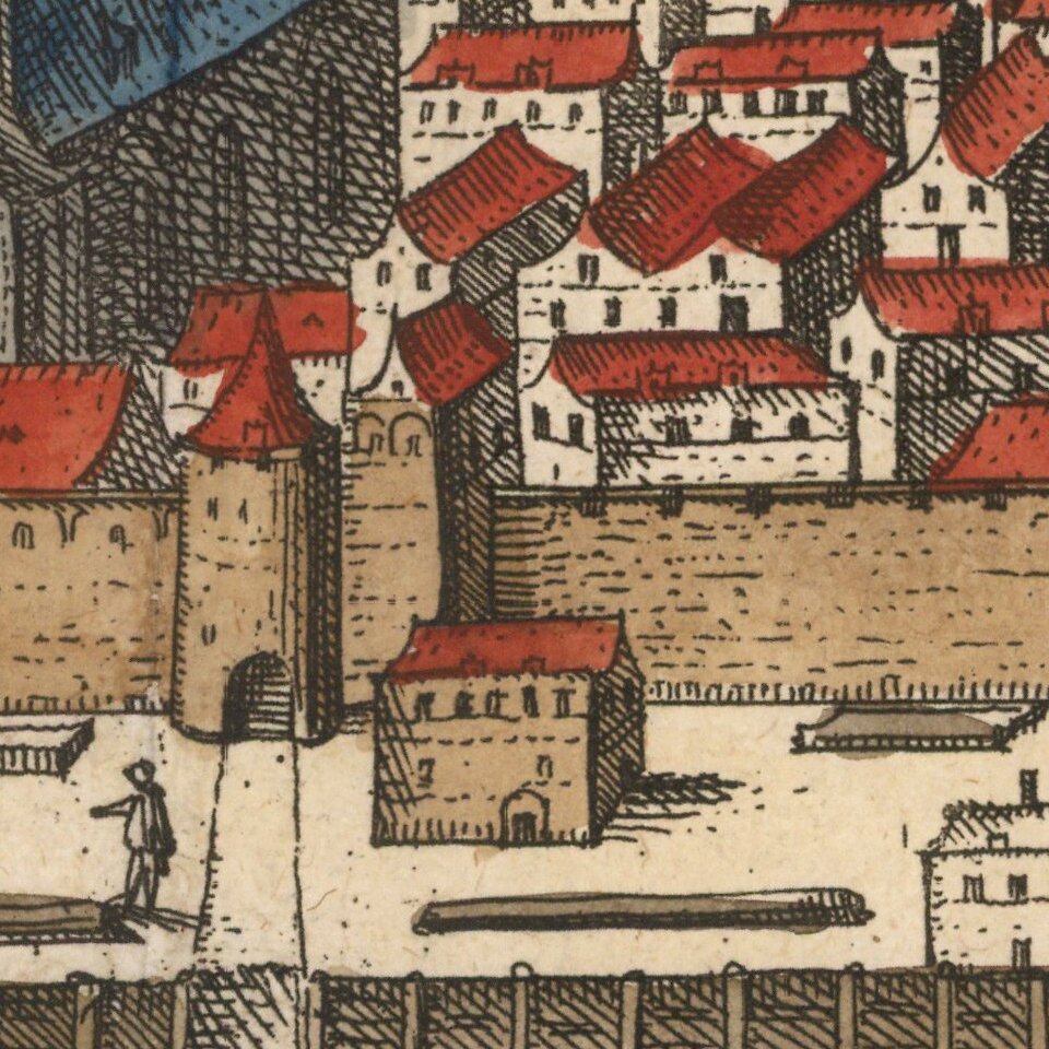 Georg Braun (1541-1622) was born and died in Cologne. His primary vocation was as Catholic cleric; he spent thirty-seven years as canon and dean at the church St. Maria ad Gradus, in Cologne. Braun was the chief editor of the Civitates orbis terrarum, the greatest book of town views ever published. His job entailed hiring artists, acquiring source material for the maps and views, and writing the text. In this role, he was assisted by Abraham Ortelius. Braun lived into his 80s, and he was the only member of the original team to witness the publication of the sixth volume in 1617.