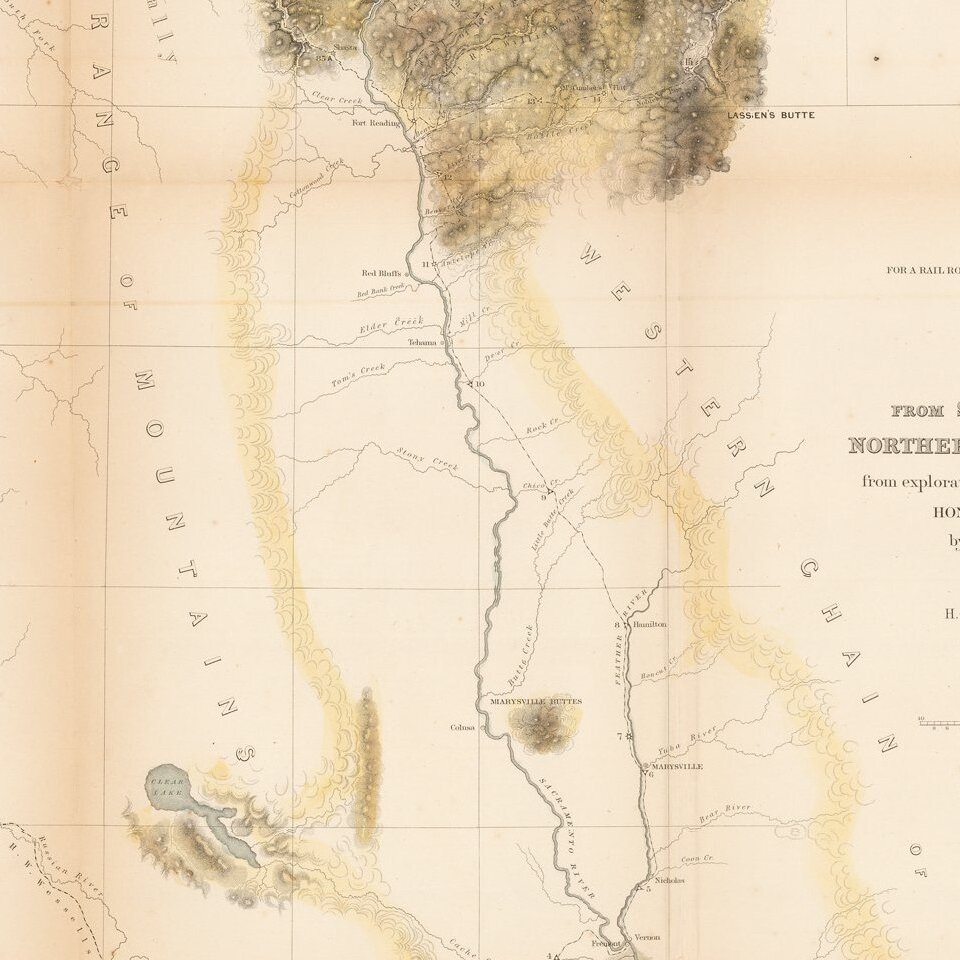 Portions of the map includes a portion of the Emigrant Trail, Warner's Route in 1849, several Williamson Routes, and Major Wessel's Route in 1852.the routes travelled by many place names, watershed details and fine hachure in the mountainous areas. The balance of the map is mostly in skeletal format with an area to the west noted as not explored 'instrumentally.' Details numerous explorations and names the survey crews. Locates the Emigrant Trail plus the earlier explorations of Warner and Williamson in 1849, and Wessell in 1852. Notes the place Warner was killed by Indians in 1849, during early reconnaissances with R.S. Williamson.