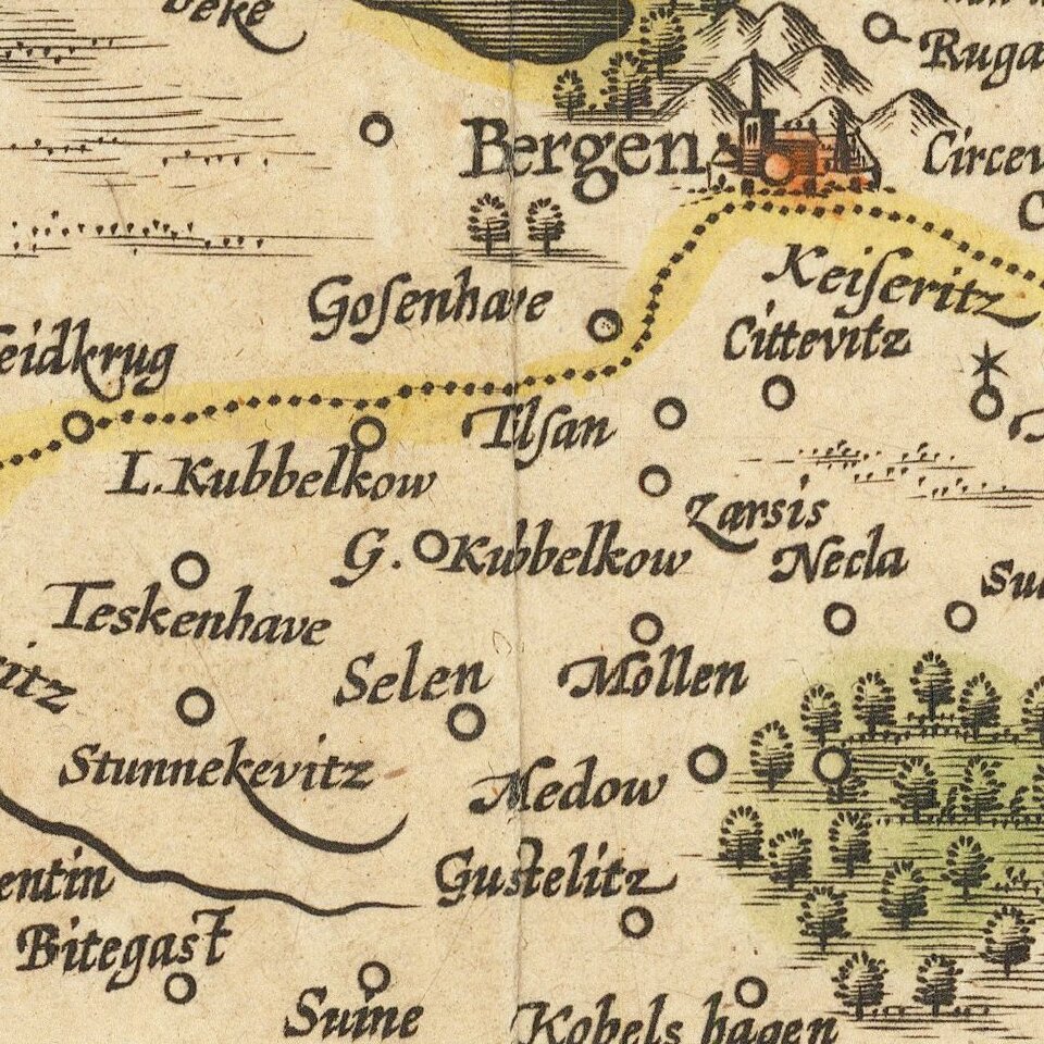 Nice example of Blaeu's map of Rugia, including large decorative cartouche, compass rose, sailing ships, sea monster and 30 coats of arms.