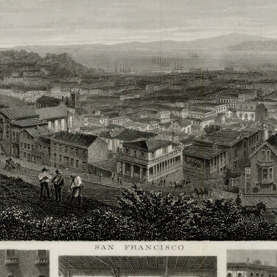 Very rare steel-engraved view of San Francisco with surrounding vignettes of various architectural landmarks of the city including: Nevada Block, Calvary Church, Palace Hotel, City Hall, Grand Hotel, Cliff House, The White House, Corner of Geary and Kearny, Mercantile Library, Oriental Block, Sansome Street, London & S. Fr. Bank., S. Mary's Cathedral, LIck Hotel, Occidental Hotel, Corner of First and Market Street, PMSS Wharf, Montgomery Street, California Street, Murphy Grant & Co. Building and Russ House.