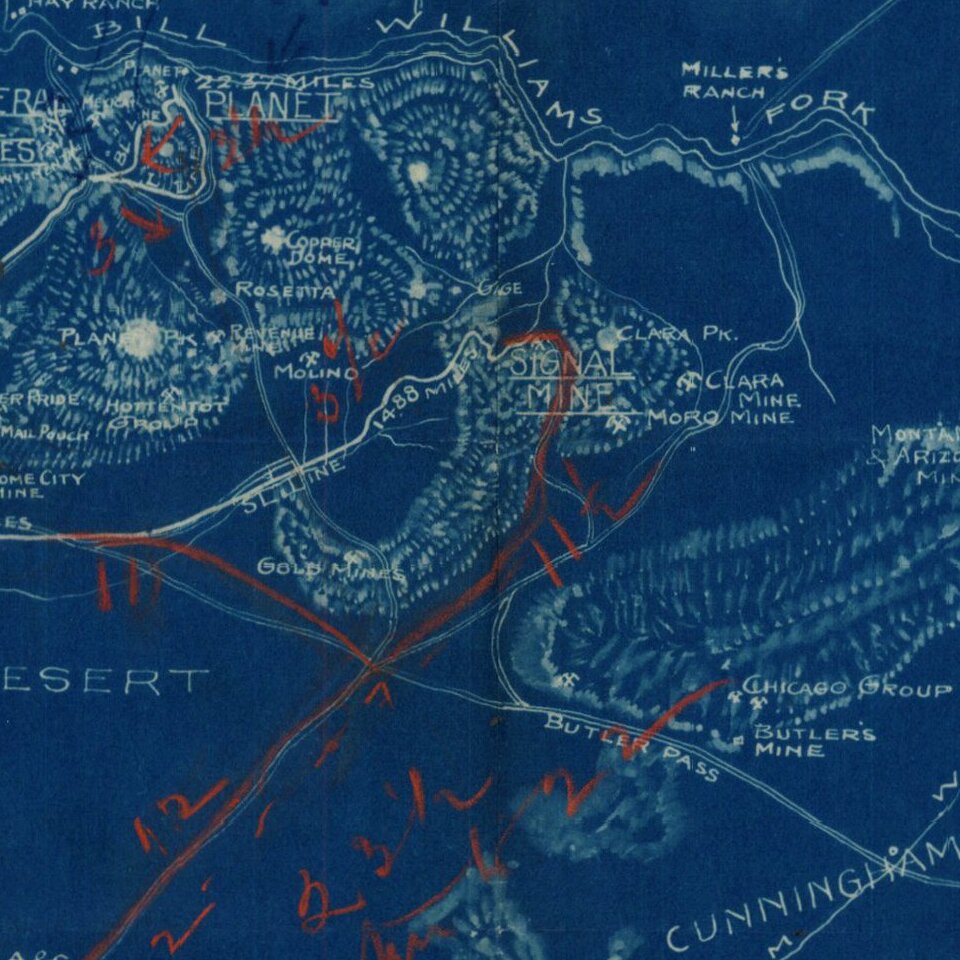 The map was produced at the height of the Copper Mining boom in the region. In both Mohave and Yuma counties, there are rich deposits of copper. In the Bill Williams Fork district, the Planet mine produced a significant amount of copper ore. At the time, the Santa Fe Railroad was actively adding lines to the region to support the mining boom.