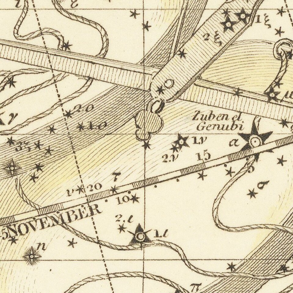 Striking star chart of the constellation Scorpio, marvelously engraved and delicately colored. Shows the featured constellations in color with neighboring stars and constellations without color.