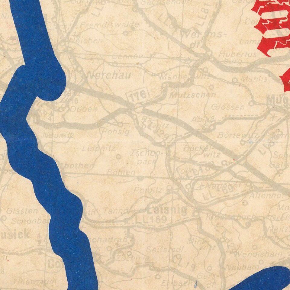 The two forces are shown moving toward each other, superimposed over a map of Germany, on the occasion of the 2 armies meeting in Torgau, Germany.