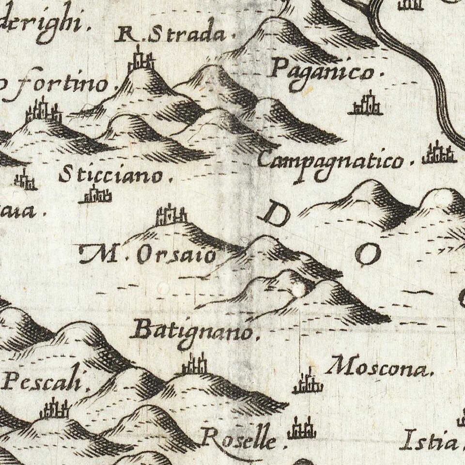 Scarce map of the "Territorio Senese" after the mural painting by Orlando Malavolti himself in 1573. The painting is believed to have been located in the Palazzo Comunale di Siena, but has been lost since the middle of the 19th Century.