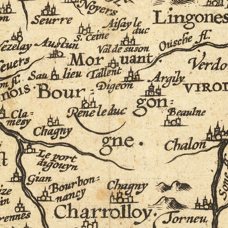A fairly close copy of this map, but without hatching of the coat of arms, was included in Bouguereau 1594.