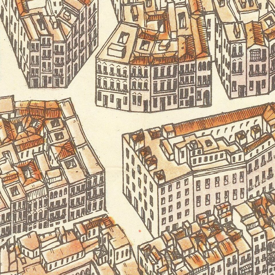 On the front, an illustrated look at the city center is shown, ith an elegant depiction of major buildings, squares, streets, etc. in three dimensions.