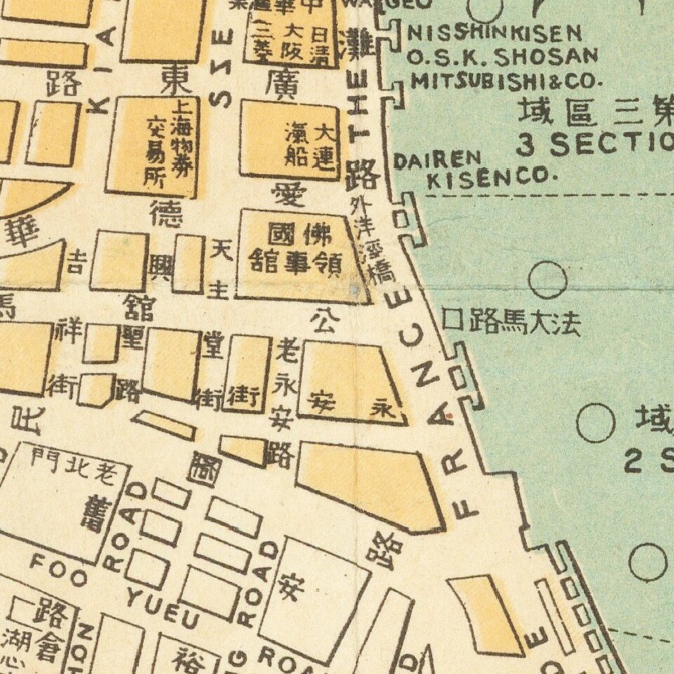 An attractive map of Shanghai, dating to just before or during the Japanese invasion. The map focuses on the International Settlement and the French concession, and extends into the "Chinese City." Shanghai is large, but far from the metropolis it today comprises. Many major roads are named throughout the city, usually both in Chinese and in English. In the French Concession, only French road names are used. Hundreds of buildings, parks, hospitals, schools, and more are all named. Railway lines are shown circling the city, and the various wharves on the Huangpu River belonging to companies such as Standard Oil, Mitsubishi, and other major multinationals are named.