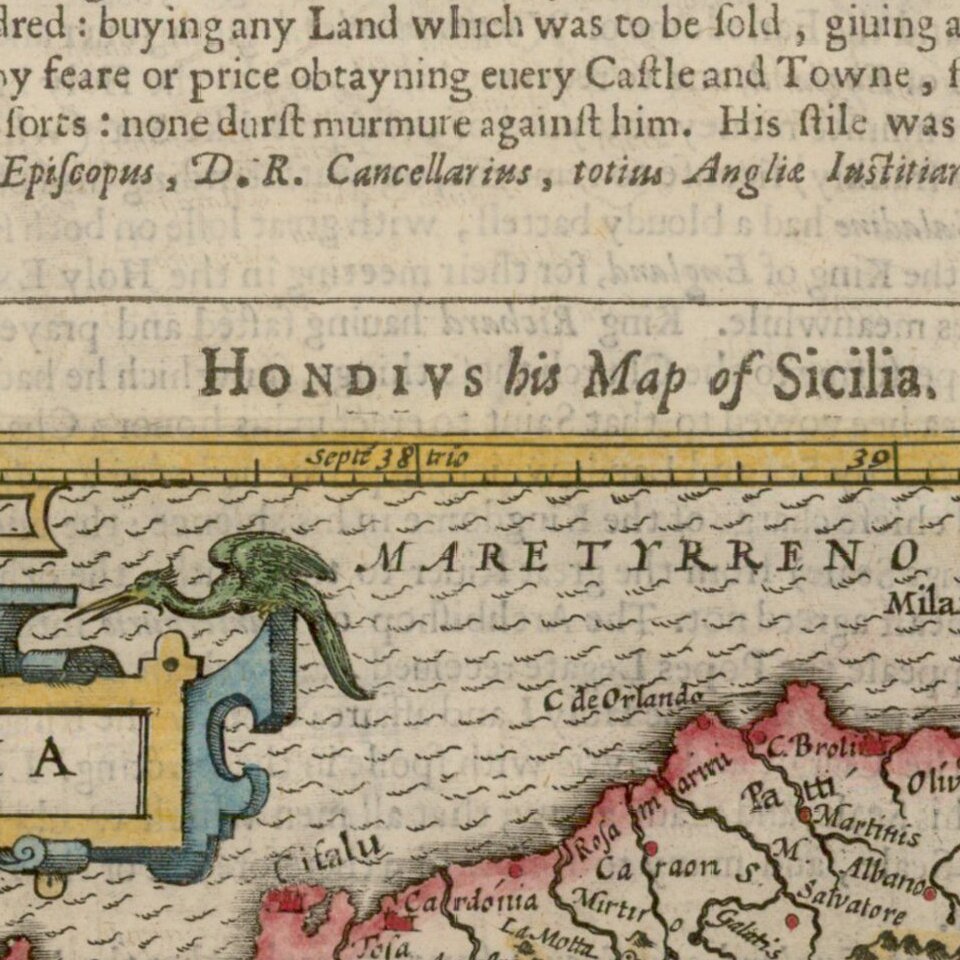 Hondius moved to London in 1584, fleeing religious persecution in Flanders. There, he worked for Richard Hakluyt and Edward Wright, among others. Hondius also engraved the globe gores for Emery Molyneux’s pair of globes in 1592; Wright plotted the coastlines. His engraving and nautical painting skills introduced him to an elite group of geographic knowledge seekers and producers, including the navigators Drake, Thomas Cavendish, and Walter Raleigh, as well as engravers like Theodor De Bry and Augustine Ryther. This network gave Hondius access to manuscript charts and descriptions which he then translated into engraved maps.