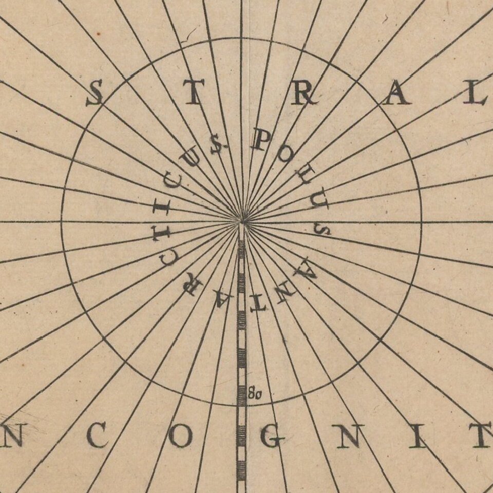 Decorative example of Jansson's map of the South Polar region, including the earliest appearance of New Zealand and Van Dieman's Land. The supposed coastline of the unknown southern continent continues to appear. Includes notes regarding the affirmation of the discovery of islands by Magellan and Hernando Galego. Nice detail in Australia showing t' Lant van P. Nuyts discovered in January 1627, Edel's Lant discovered in 1619, Eendrachts discoveries in 1616, as well as notes mentioning Williams Renier and Dirck Hertogs Ree and several other place names and early contacts with Australia.