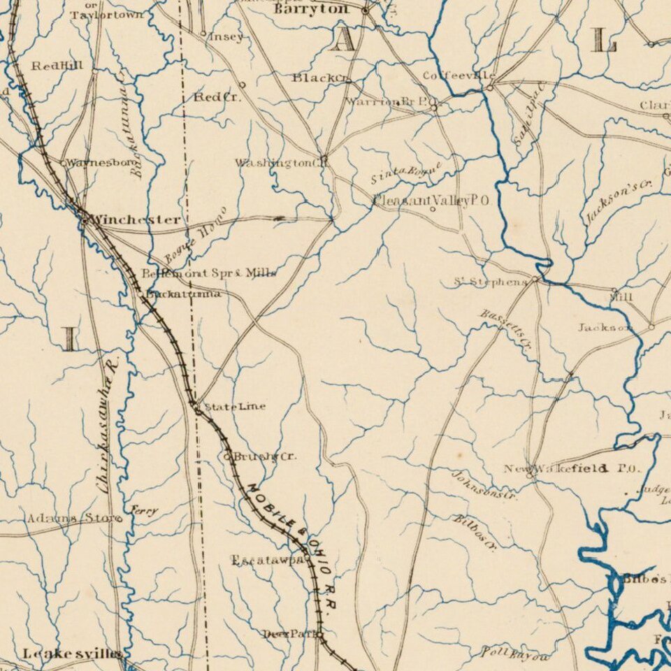The map shows Mississippi and Alabama from Jackson to Montgomery, starting about fifty miles north of these important cities and extending south to New Orleans and the Gulf of Mexico. The map depicts the lines of important southern railroads, including: