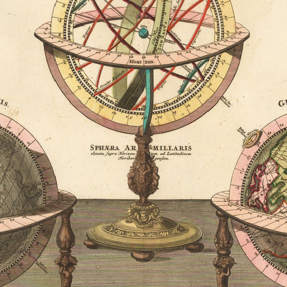 Included are decorative illustrations of a celestial globe, terrestrial globe and armillary sphere, with an explanation in Latin.