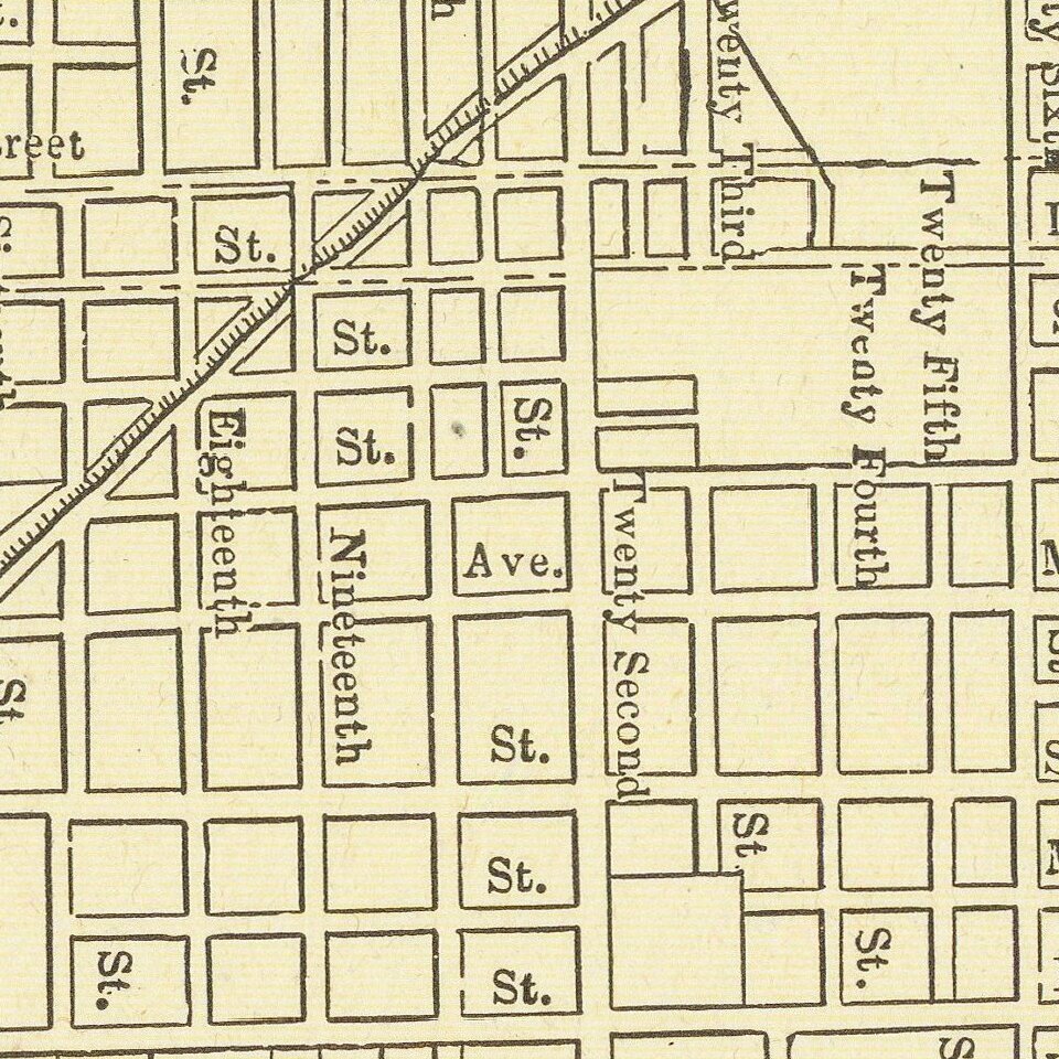 Detailed city plan of St. Joseph, showing streets, buildings, train lines, public places, rivers etc.
