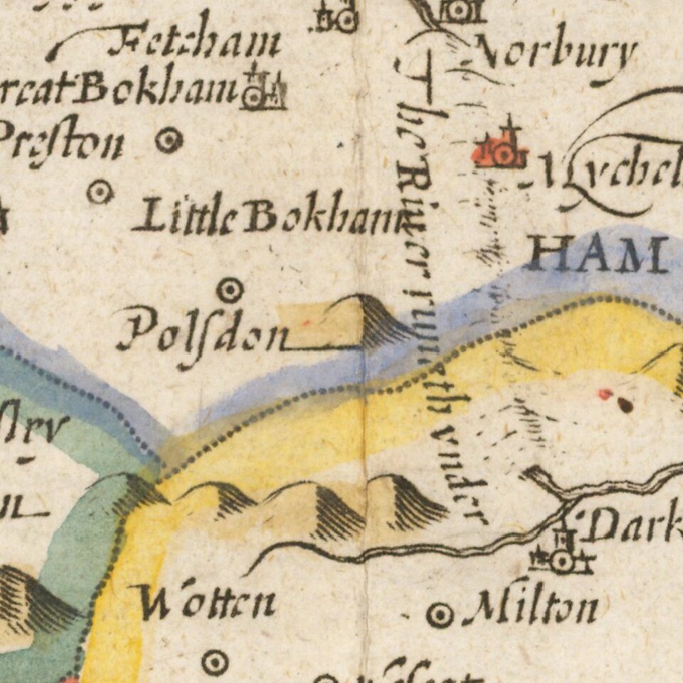 1676 edition of Speed's map of Surrey, from Speed's Theatre of Great Britain, published in 1611 (with credit to John Sudbury and George Humble).