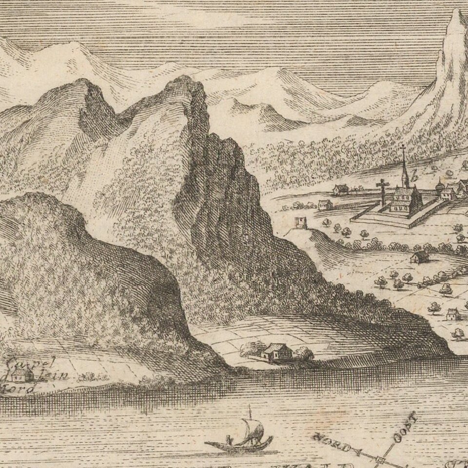 Detailed antique engraved view of Schwyz, Switzerland, probably published in Bodenehr's Curioses Staats und Kriegs Theatrum.