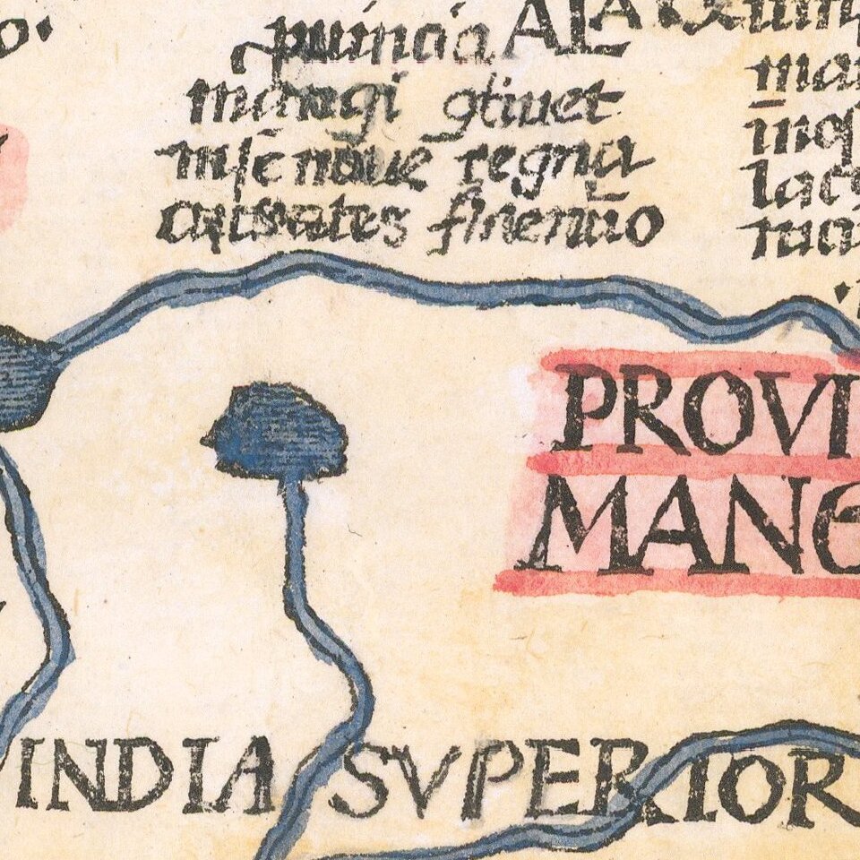 Fries also prepare three new maps for the Geographia: maps of South-East Asia and the East Indies, China and the World. The cartographic details for these 3 modern maps derives from Waldseemuller's world map of 1507, which Fries had viewed and copied prior to 1520, utilizing this information for the preparation of the 1520 Apian World map identified above.