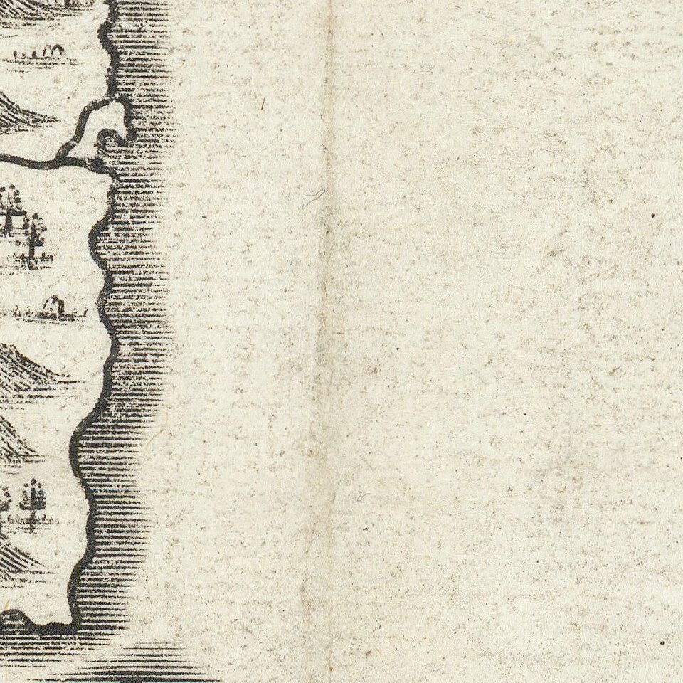 The map comes from Kircher’s famous work, Mundus Subterraneus, which explored the subterranean world. Kircher was deeply interested in the unseen workings of the underground world. He had researched volcanoes extensively, observing eruptions at Etna and Stromboli. He also had himself lowered into the crater of Vesuvius to view the effects of an eruption, only years after the volcano had killed over 4,000 people in an explosion.