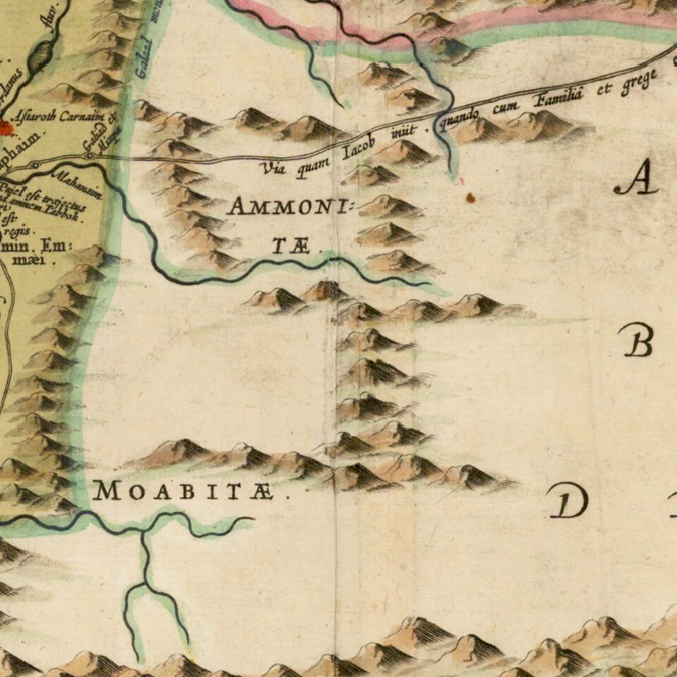 Decorative regional map of the Holy Land, showing the travels of Abraham, Isaac and Jacob.