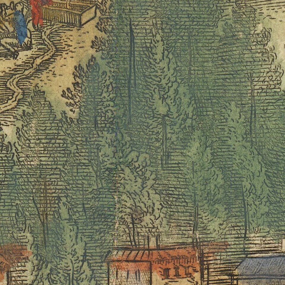 The view features scenes of merry-making, feasting, and dancing, but with the striking and prominent mountain peaks. Tempe also alludes to the power of the gods. Moreover, with an engraved temple and alter of Jupiter featured, Ortelius' Tempe is truly a nod to the mythical, magical, and fabled. The view was based on information from ancient sources, specifically, the writings of Ovidius, Athenaeus, Plinius, Herodotus, and Aelianus.