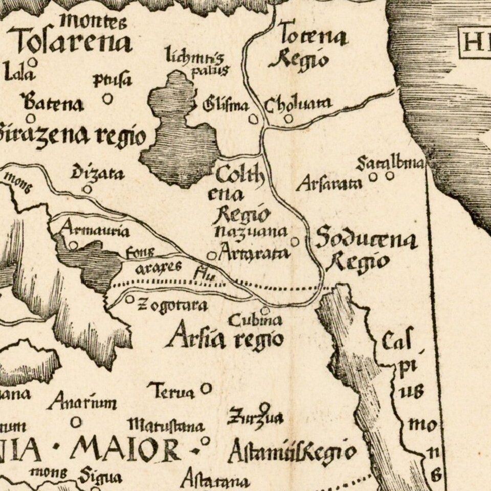A striking example of Waldseemuller's map of the region between the Black and Caspian Seas, centered on Armenia.