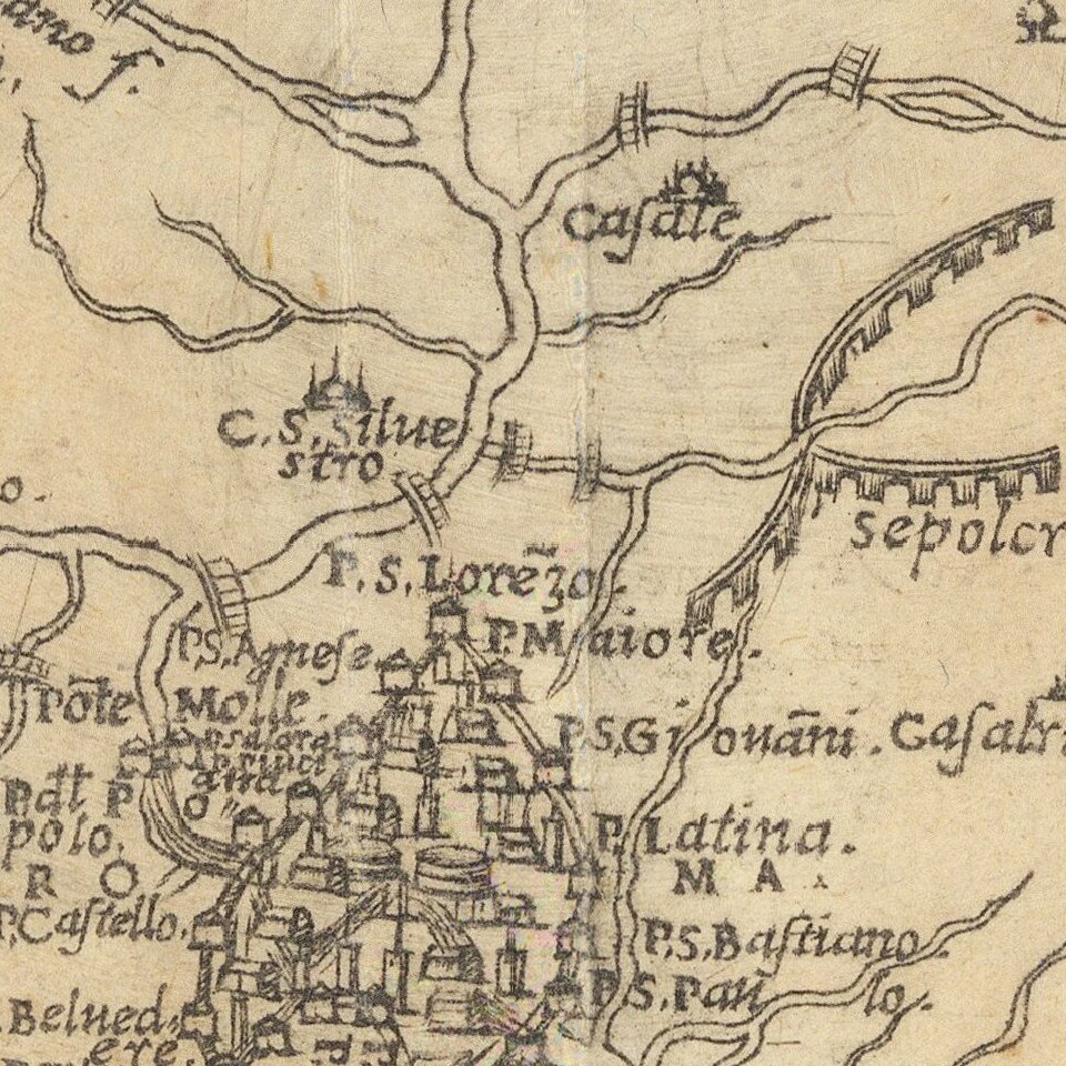Scarce modern map of the region around Rome, published by Giralomo Ruscelli in 1574.