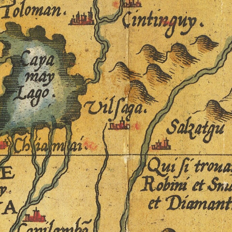 De Jode's map is drawn directly from the first (northern) two sheets of Giacomo Gastaldi's rare 4-sheet wall map of Southeast Asia, China and India, perhaps the single most influential map of the region published in the 16th Century. The map extends from China and the Philippines to India and Mongolia.