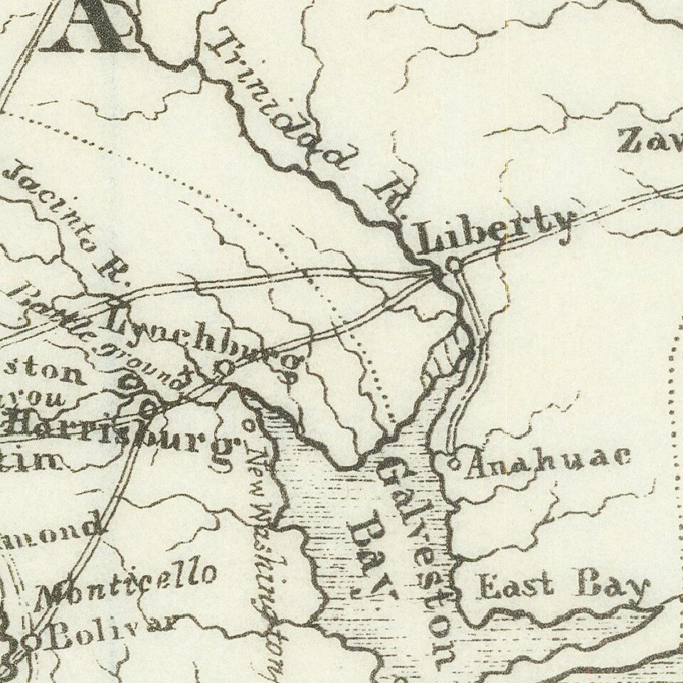 The map shows the area from New Orleans westwards to about 102 degrees longitude, and south to the Rio Grande. There is considerable detail devoted to the settlements from Goliad north to Austin, and then east to Liberty. The map locates the 7 temporary capitals (San Felipe de Austin, Washington-on-the-Brazos, Harrisburg, Galveston Island, Velasco, Columbia, and Houston).