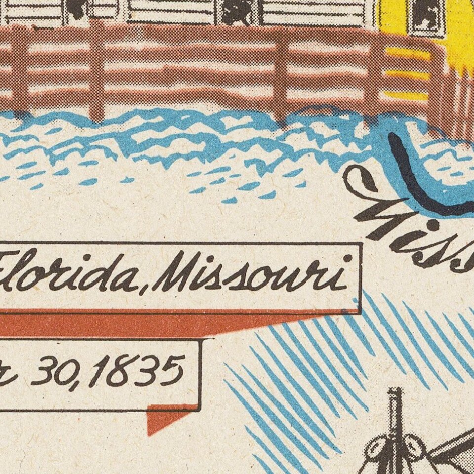 Decorative pictorial map telling the story of Mark Twain, published by Warner Brothers, in conjunction with its release of the movie of the same title.
