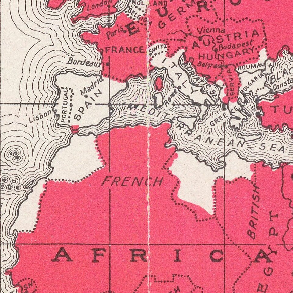The map shows that 940,568,000 people were somehow affected by the war through living in belligerent territories. The United States had not entered the war when this map was issued.