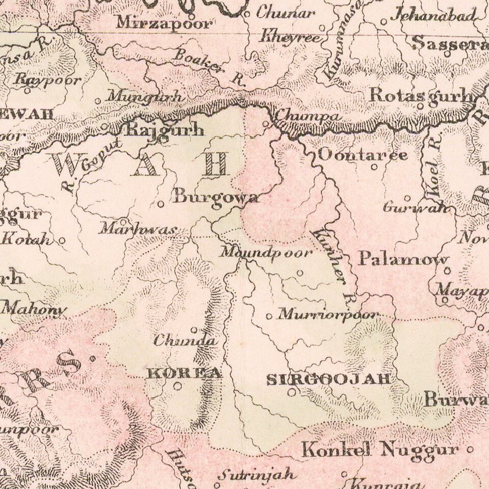 Highly detailed map of India, Pakistan, Afganistan, Tibet and the Himalayas, extending east to Siam.