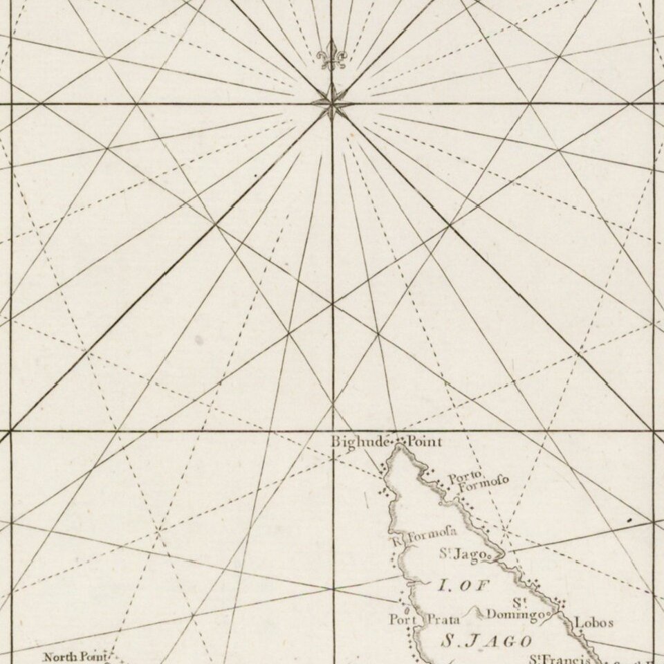 This sheet of sea charts details the Cape Verde Islands. First settled by the Portuguese in 1462, it soon became a popular haunt for pirates, including Sir Francis Drake in the 1580s.