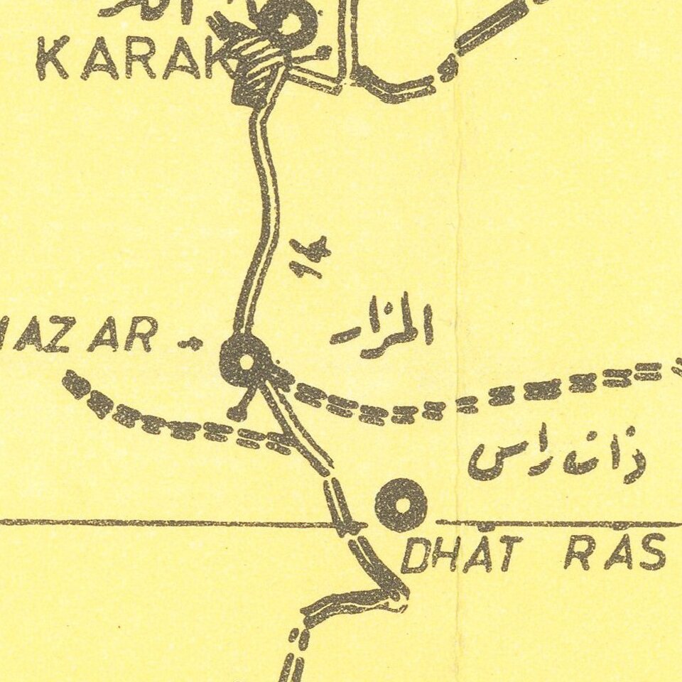 Scarce bilingual (English and Arabic) pictorial tourist map of Jordan, with extensive illustrations in the borders featuring the country's archaeological sites. The verso has maps of Amman and Jerusalem, the latter of which, after the 1948-49 annexation of the West Bank, was partially under Jordanian control. Part of Jerusalem is labeled "Ex-Jewish Quarter".