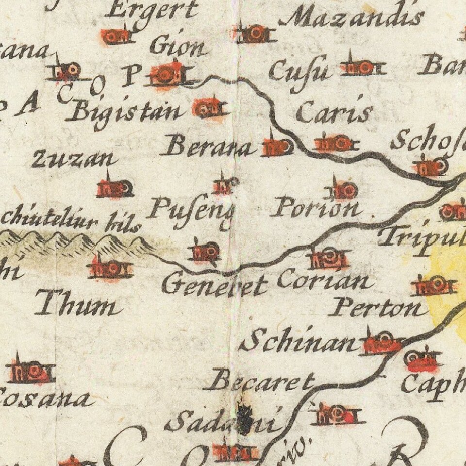 Includes four town view vignettes across the top and 4 sets of costumes. The text on the verso provides a colorful Anglo-centric view of life in Persia at the beginning of the 17th Century.