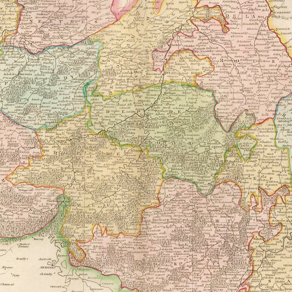 Detailed map of the Belgian Netherlands, including Roer, Rhin & Moselle, Mont-Tonnerre, Saare, Fortes, Sambre & Meuse, Jemmapes, Lys, Escaut, Deux-Nethes, Meuse Inferieure, L'Ourt, and Dyle. Large detailed map.