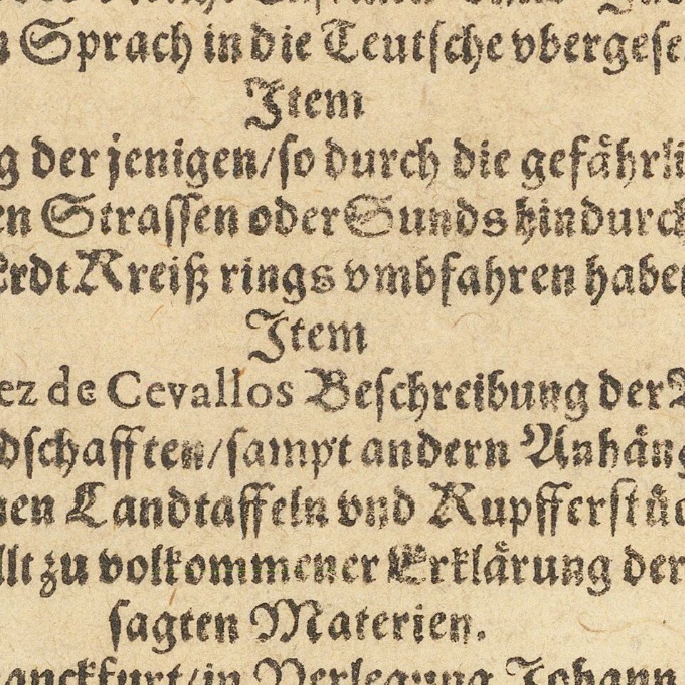 The 1623 title page is a much more involved composition than that of the 1622, with the additions of inset medallion busts of Christopher Columbus and Amerigo Vespuci, as well as the figures of Magellan and Pizarro flanking the map. The whole image is surmounted by the coat of arms of Castile. Two the left and right of the title block are engravings of the Aztec gods.