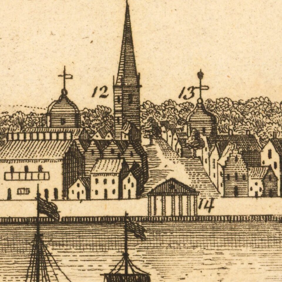 Beginning in 1716, William Burgis stood at the Brooklyn Heights shore and drew the waterfront along the east side of Manhattan, calling it “A South Prospect of the Flourishing City of New York in ye Province of New York in America.” The drawing was sent to London, where John Harris engraved the image on four copper plates, which when printed and joined created a six foot wide panoramic view of the City, which was first advertised for sale in America in 1721 in The American Weekly Mercury as “A Curious Prospect of the City of New-York…”