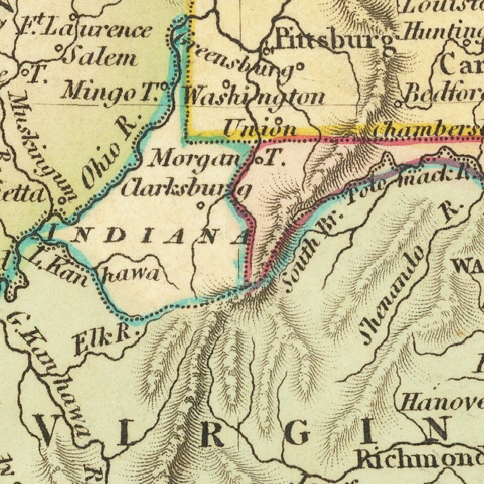 Perhaps the most unique feature of this map is the inclusion of the "State of Franklin," to the west of Virginia and the East of Kentucky. In fact, this short lived breakaway group was located between North Carolina and Tennessee, as noted below. Indiana is also shown where Ohio would normally appear.