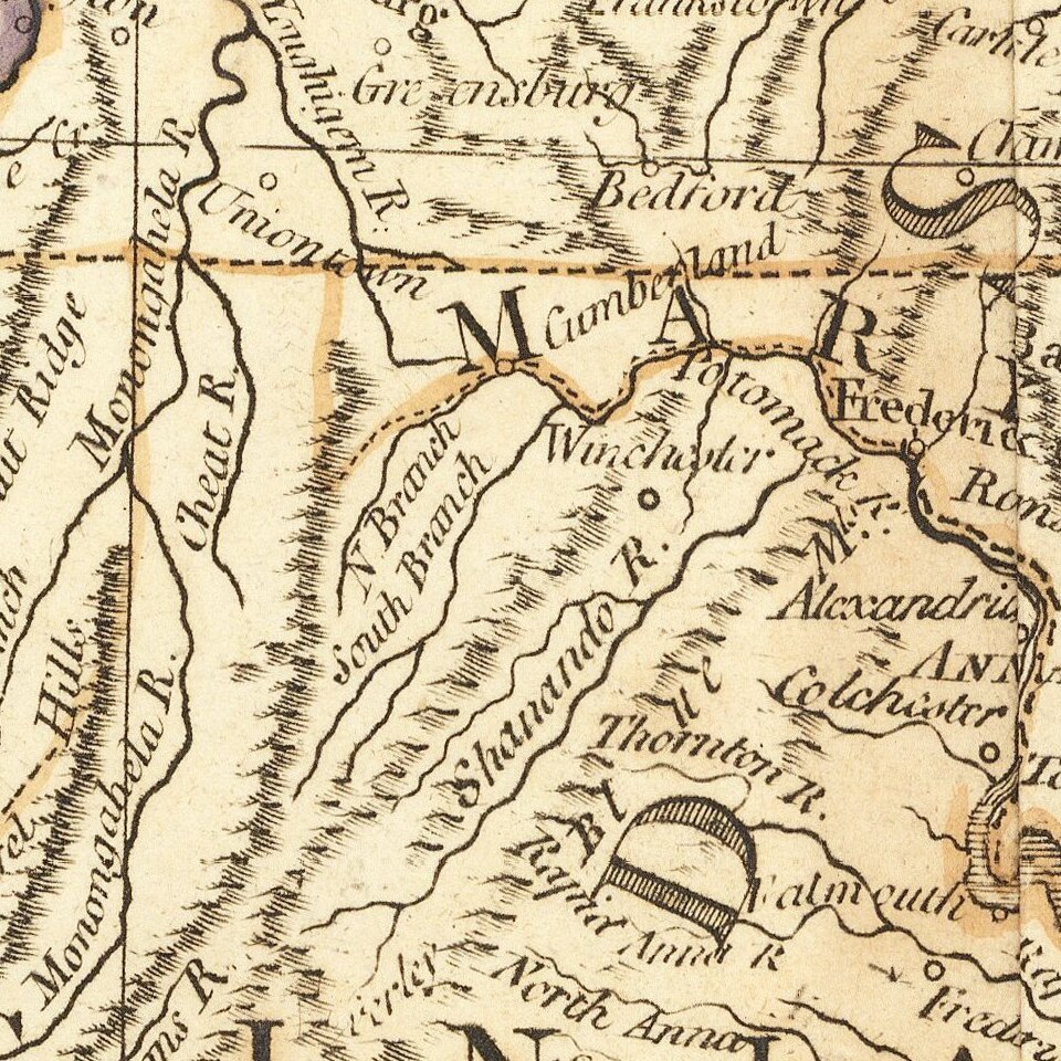 The map is one of the few maps to record the short-lived state of "Franklinia." In the latter part of the 18th century, the settlers in Western North Carolina and Eastern Tennessee decided that because of poor representation in State Government, they needed to form a state of their own. A government was formed and initial organizational meetings conducted, but the breakaway state was quickly quelled by the North Carolina authorities, although not before the State of Franklinia began appearing on a number of English maps during the period. Ben Franklin himself responded that while he was honored by the decision to name a state after him, he was not able to relocate.