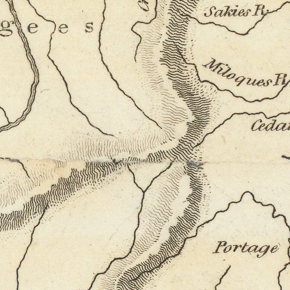 The appearance of Illinois (organized in 1809) and Indiana (organized 1800), are among the earliest on a printed map. Illinois is pushed considerably west of its true location. Chicago is part of the Northwest Territory above Illinois, and noted as US Land, a vestige of its acquisition in the Treaty of Grenville. There are settlements along the Mississippi, but none in the interior of Illinois.