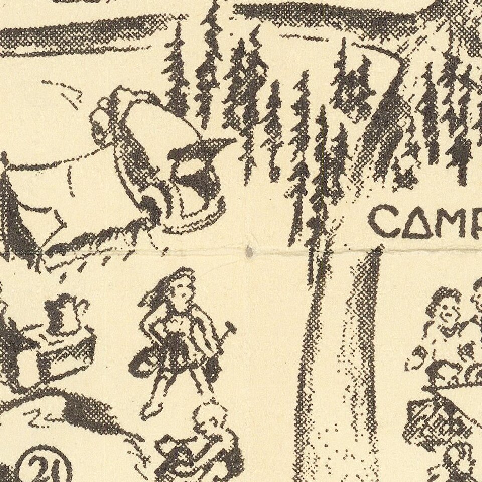 A whimsical 1946 pictorial map of the Yosemite National Park, California. Made to be folded twice and sent through the mail. . . . Map showing several landmarks and places of interest, including Half Dome, Clouds Rest, Little Yosemite, Indian Village, wildlife, recreational facilities, roads and trails.