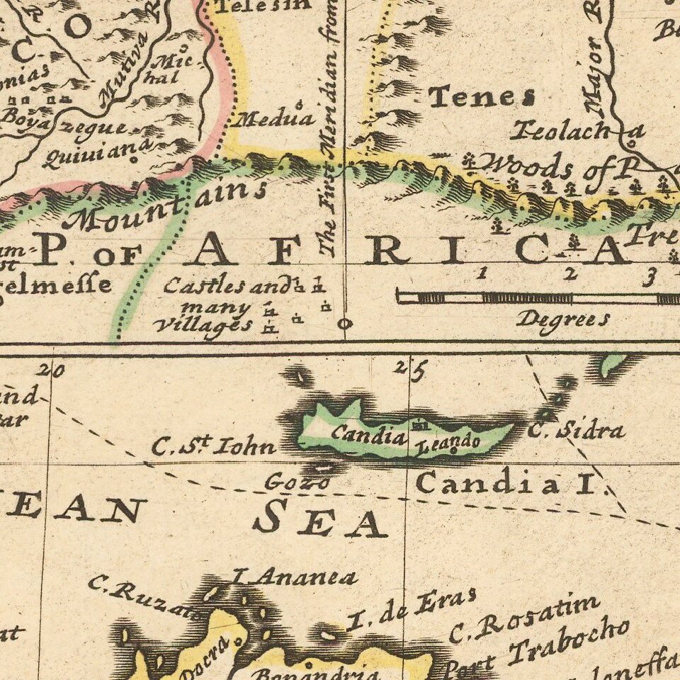 A nice example of Herman Moll's 1729 miniature engraved map of North Africa in two images on the same sheet, from his Atlas minor.