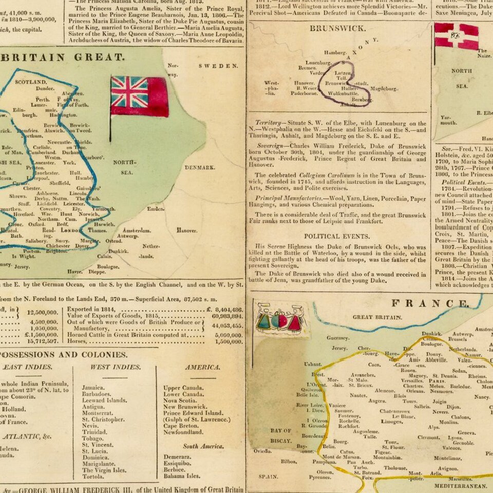 Third and Improved Edition of The Present State of Europe, With Maps of the Territories, as Settled by the Congress of Vienna.-- The Flages of the Different Nations, Coloured. And a Summary of the Events leading to the Alterations; intended for a useful and enteraining Chart of Reference, in the Library & Counting House, and Auxiliary in Schools, to the understanding of the Points of Modern Historical Geography; with the dates of the several Treaties of Peace, the Commencement of Wars, Accounts of Battles, & c . From the Year 1783, to the Present Time.